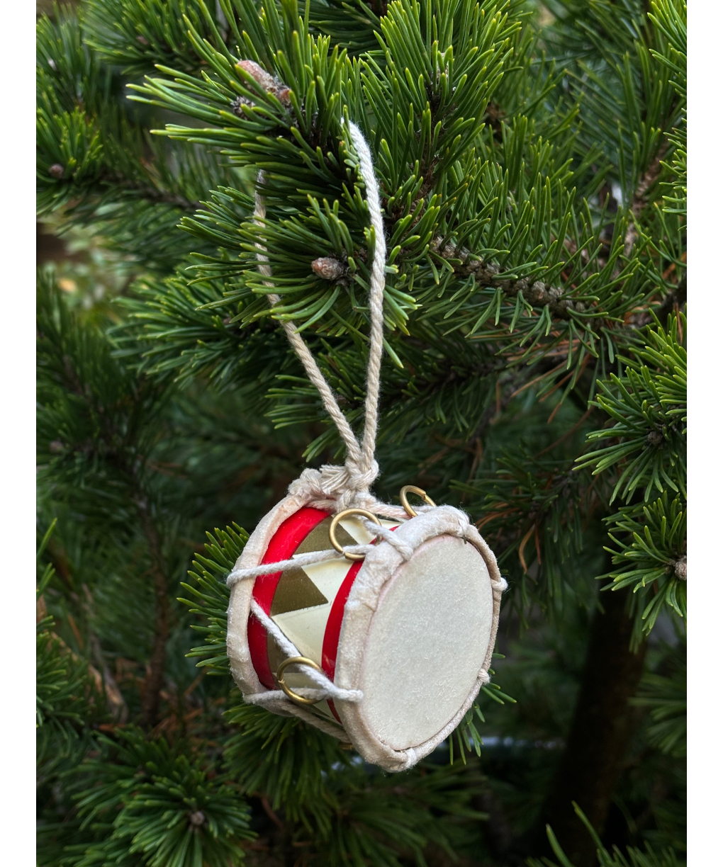 lovely miniature paper red drum christmas tree ornament with finest details, cord, metal rings, painted and laquered details