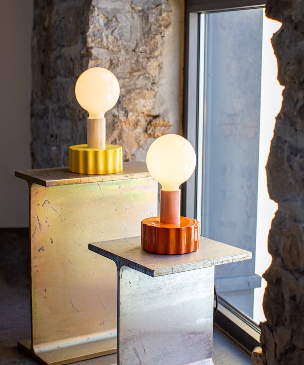Designed by London-based artist Natascha Madeiski, the Flaming Stars lighting collection for Pulpo includes this ceramic table lamp called the Little Mama lamp in yellow.