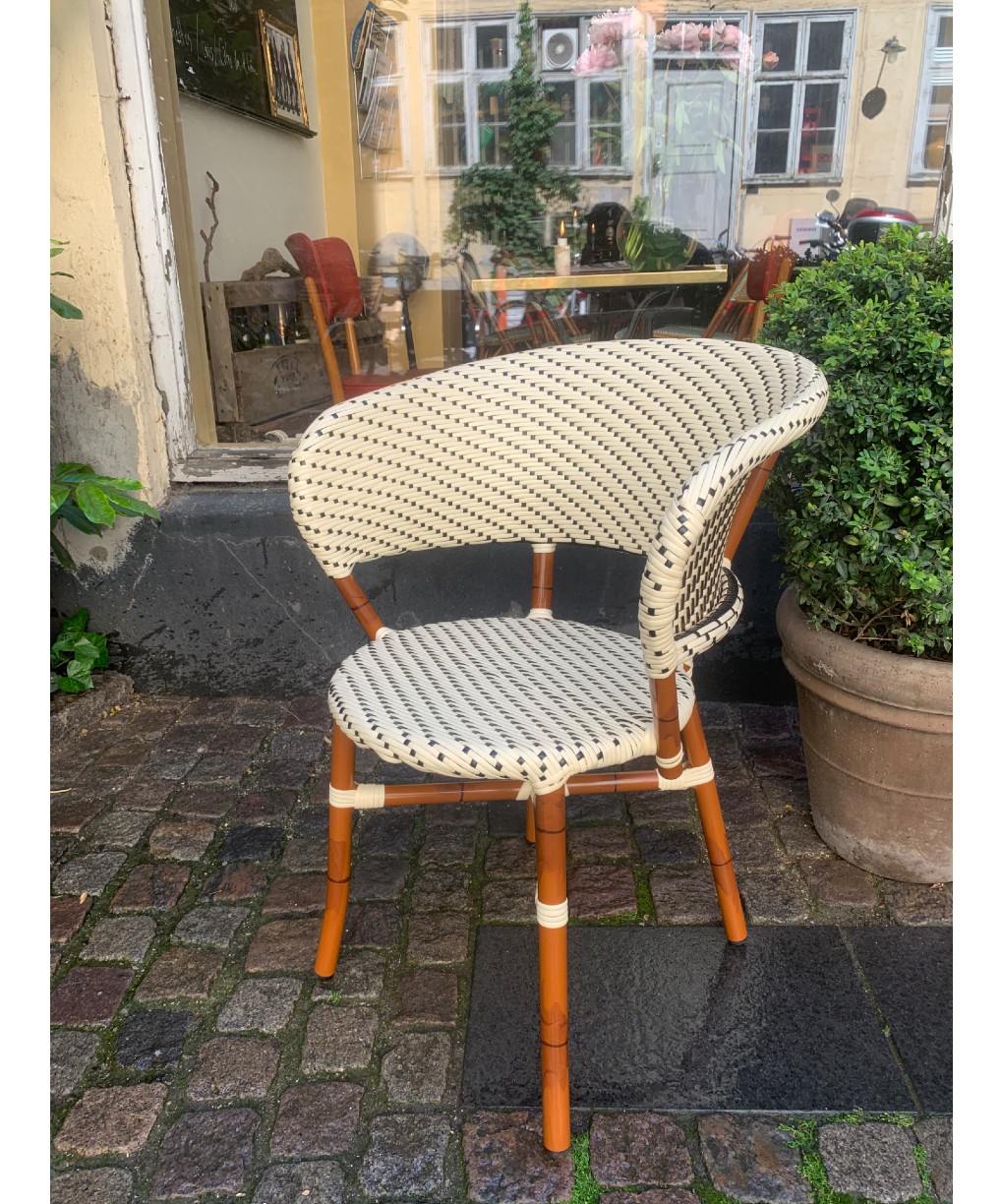Via arkaden kan du gå ind til baghuset, hvor du finder vores franske vincafé. I denne franske oase kan du indsnuse stemningen og nyde en omelet, en croque Monsieur eller croque Madame eller nogle af de andre franske produkter fra vores menukort. I den varme sommer kan du udenfor mellem blomster og småtræer sidde og nyde en kir eller et glas køligt rosévin tæt på den pulserende by og alligevel beskyttet mod trafik og støj.