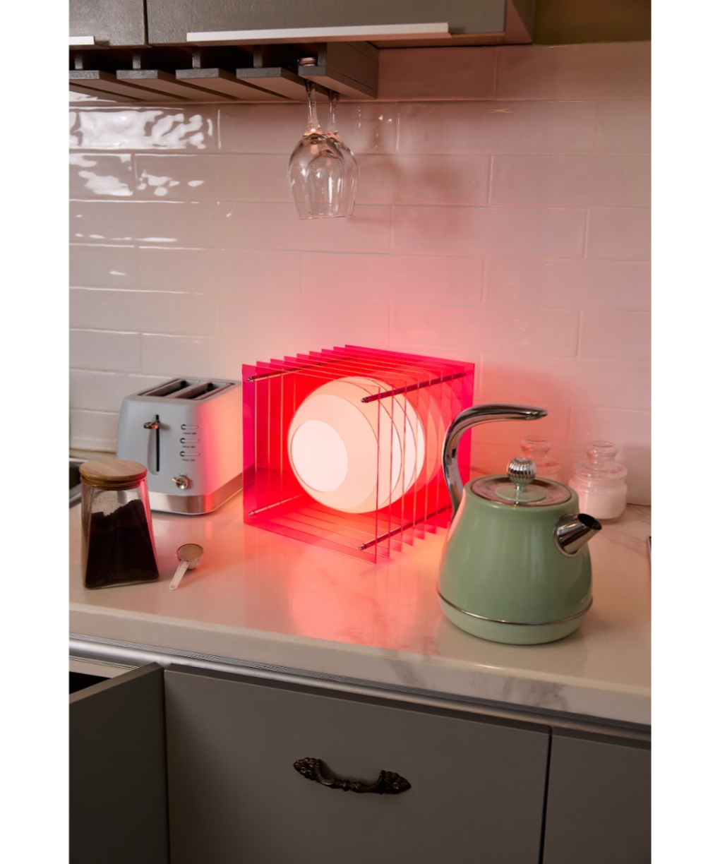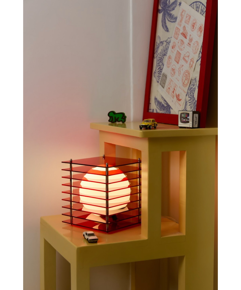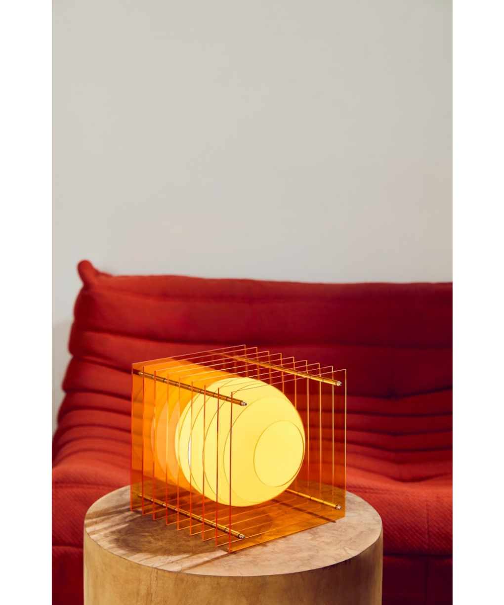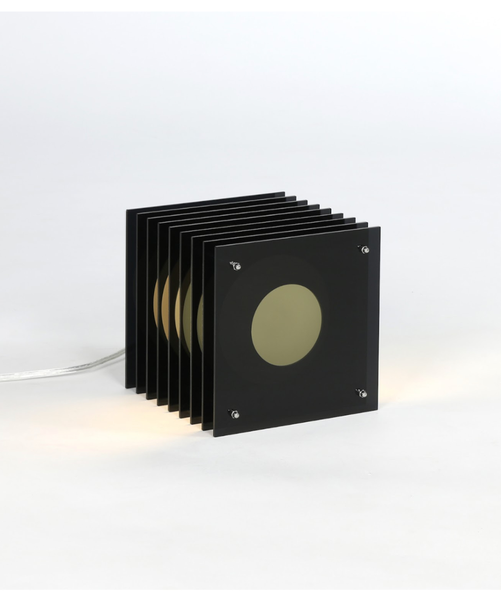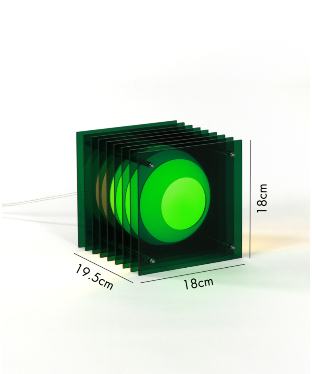 This sculptural Lamp creates a hypnotic Toy of light. Lop consists of a sphere in white opaline glass that appears to float amidst acrylic strata. Toy’s interlocking volumes create a surprising visual effect. When lit, the sphere’s reflections materialize on the row of Acrylic plates, giving an impression of movement. Even though the sphere is static, its multiple reflections give the illusion that it is animated by movement.