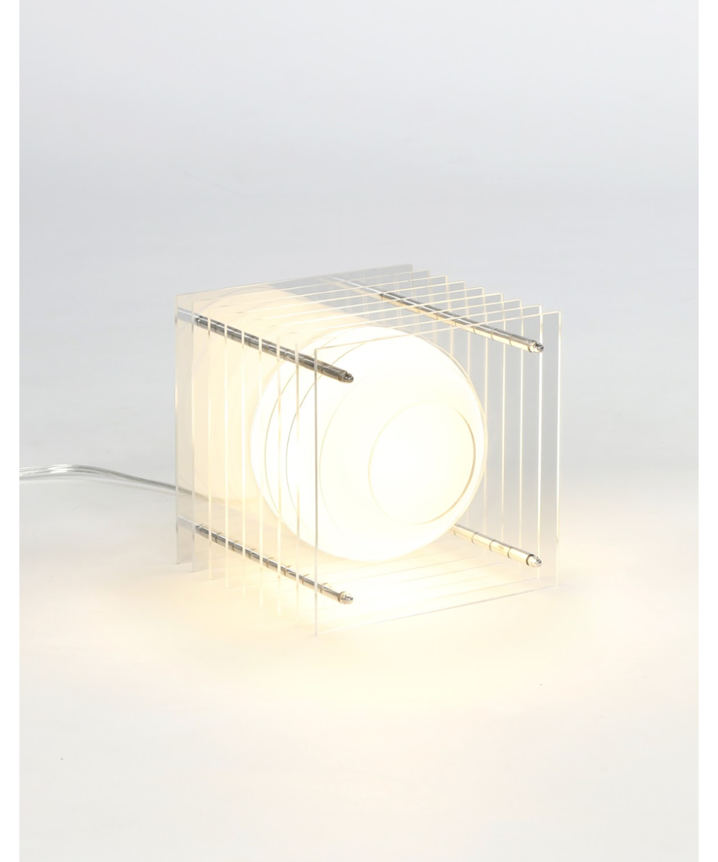This sculptural Lamp creates a hypnotic Toy of light. Lop consists of a sphere in white opaline glass that appears to float amidst acrylic strata. Toy’s interlocking volumes create a surprising visual effect. When lit, the sphere’s reflections materialize on the row of Acrylic plates, giving an impression of movement. Even though the sphere is static, its multiple reflections give the illusion that it is animated by movement.